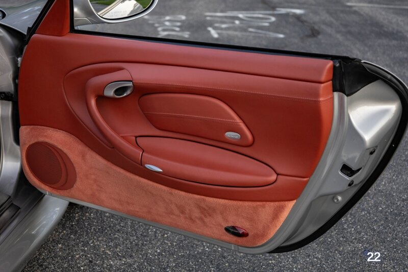 Optioned with Sport seats with painted to match Arctic Silver hardbacks, heated front seats, rear wiper, 3-spoke steering wheel in Boxster Red, Sound Package, Xenon lights, Ignition lock in Boxster Red leather, Speaker trim and vents in Boxster Red leather, Instrument cluster/Radio surround/Center console painted to match in Arctic Silver.