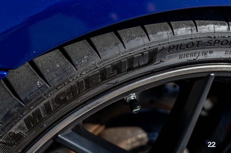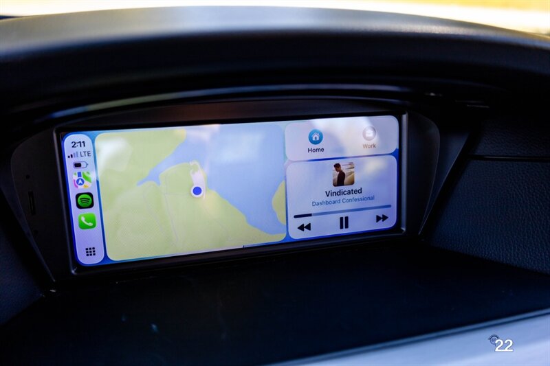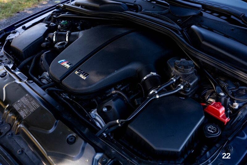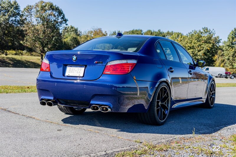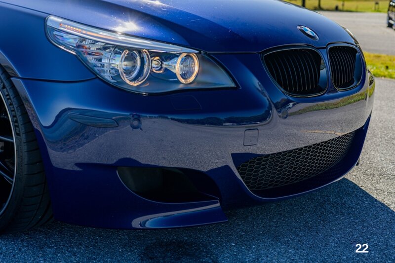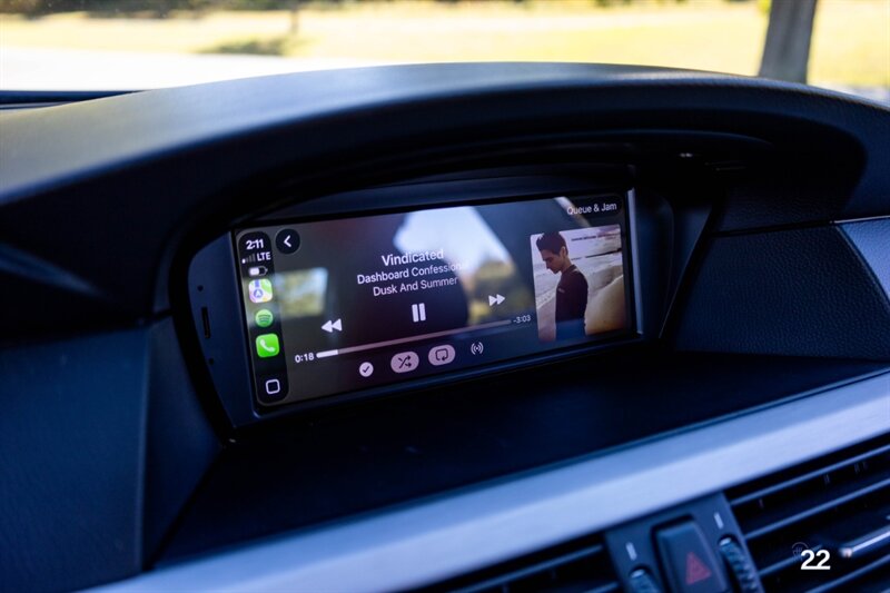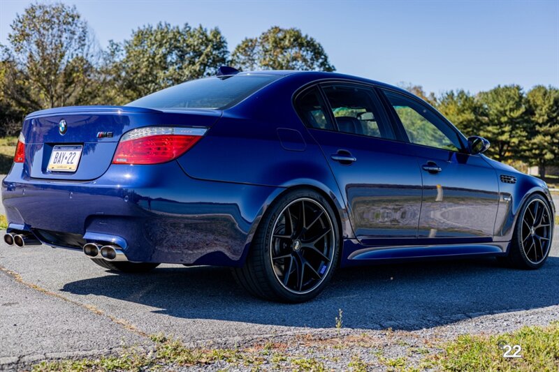 Some very special and high dollar upgrades were done on this M5. BBS CI-R wheels in black with polished lip in 20x9" et25 up front with 265/30/20 Michelin Pilot Sport 4S tires and 20x10.5" et35 rear with 295/30/20 Michelin Pilot Sport 4S tires. BBS decals in blue plus BBS black center caps + OEM TPMS sensors. The springs were replaced with H&R sport springs. Modified OEM mid pipe to remove the secondary cats are paired with Eisenmann reman mufflers. The sounds from this setup are truly amazing and make the S85 V10 sing. Lastly, wireless/touch screen Apple Cayplay/Android Auto unit was added in place of the OEM navigation screed and works flawlessly with the iDrive setup.
