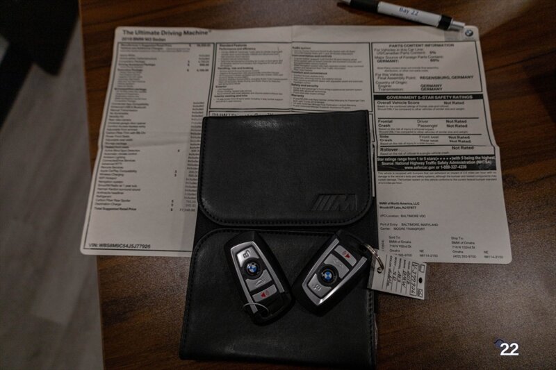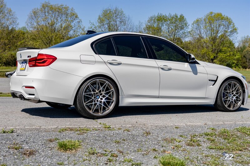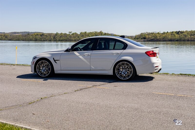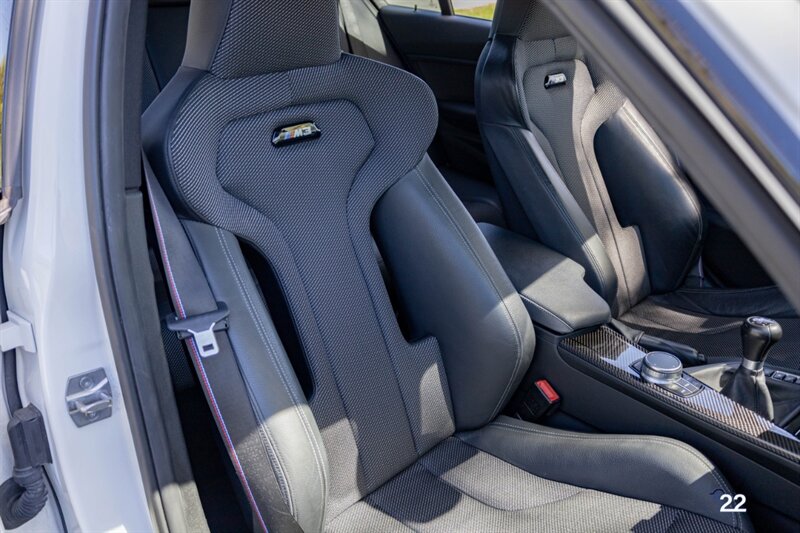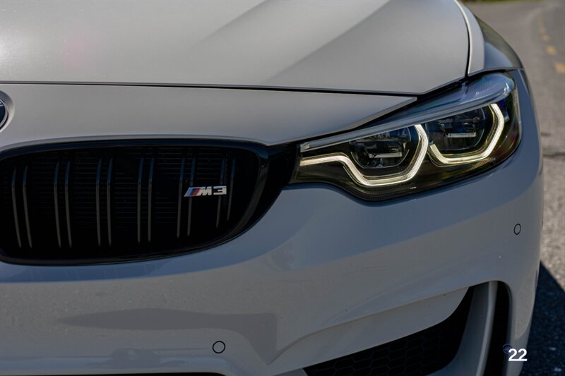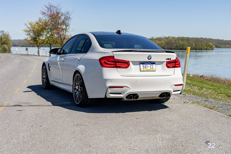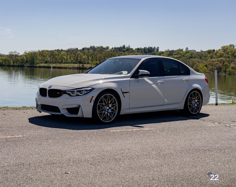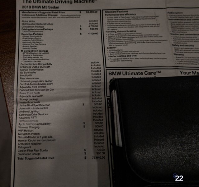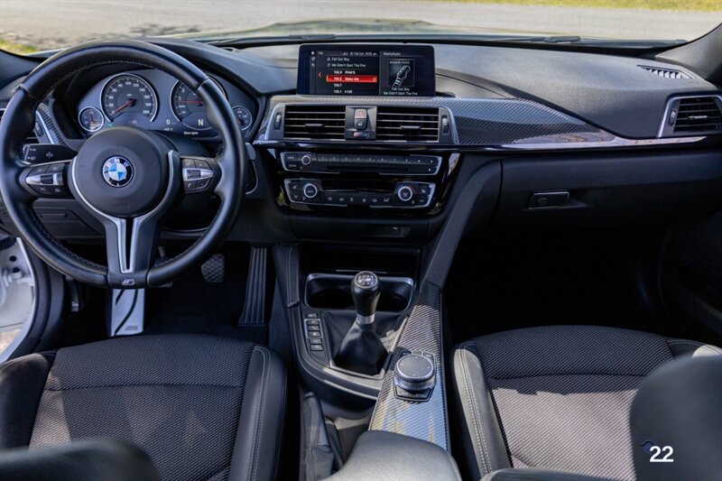 2018 BMW M3 in Alpine White with Carbon Structure/Leather interior. This 6 speed manual M3 is optioned with the Competition package (20" 666M wheels, adaptive M suspension and shadowline exterior trim), Carbon fiber roof, Front power seats with memory and heating, Carbon fiber interior trim, Driver assistance package, Executive package (heated steering wheel, park distance control, adaptive full LED headlights, auto high beam, side and top view cameras, parking assistance and heads up display), Active blind spot monitoring, Apple Carplay, Wireless charging and M Performance rear carbon fiber rear spoiler.