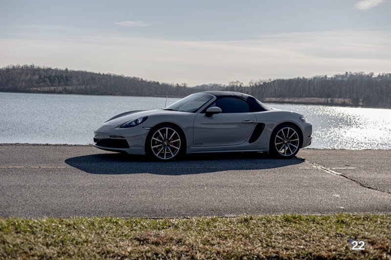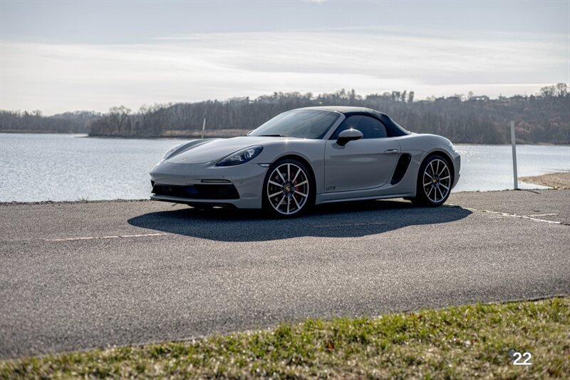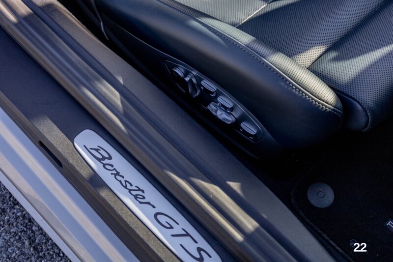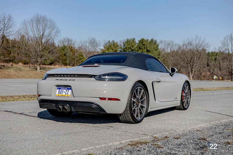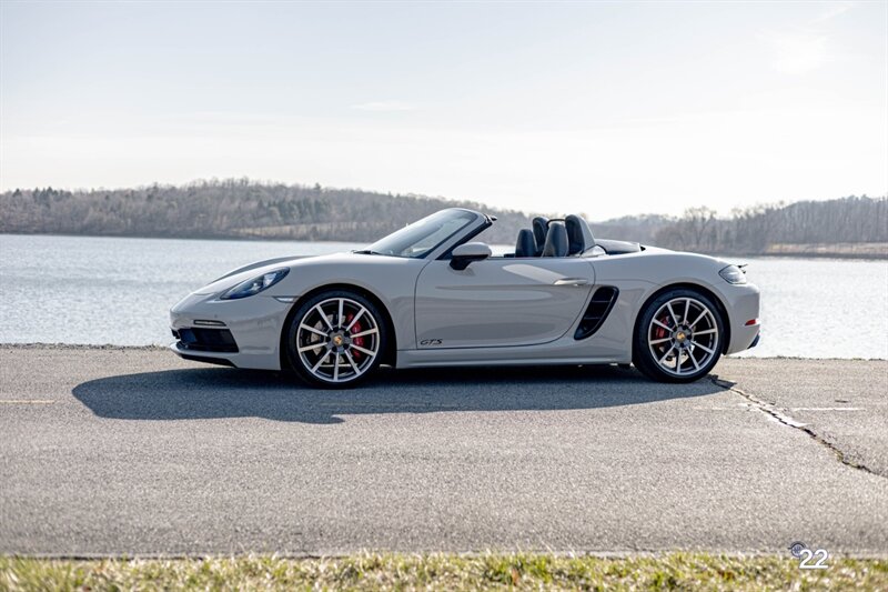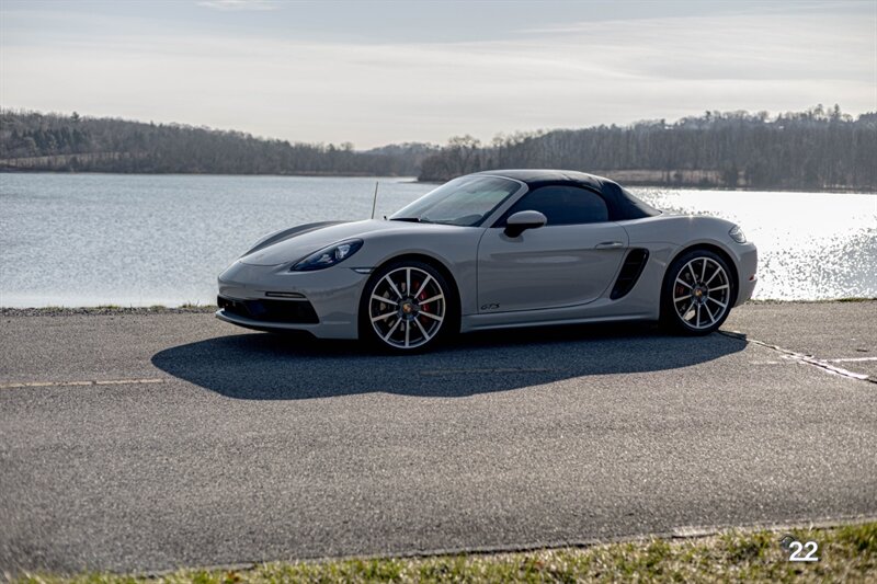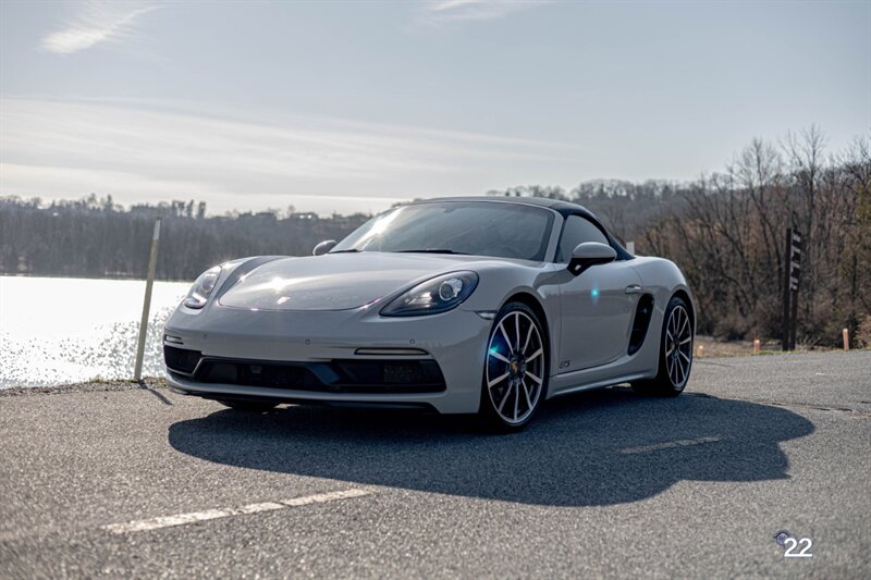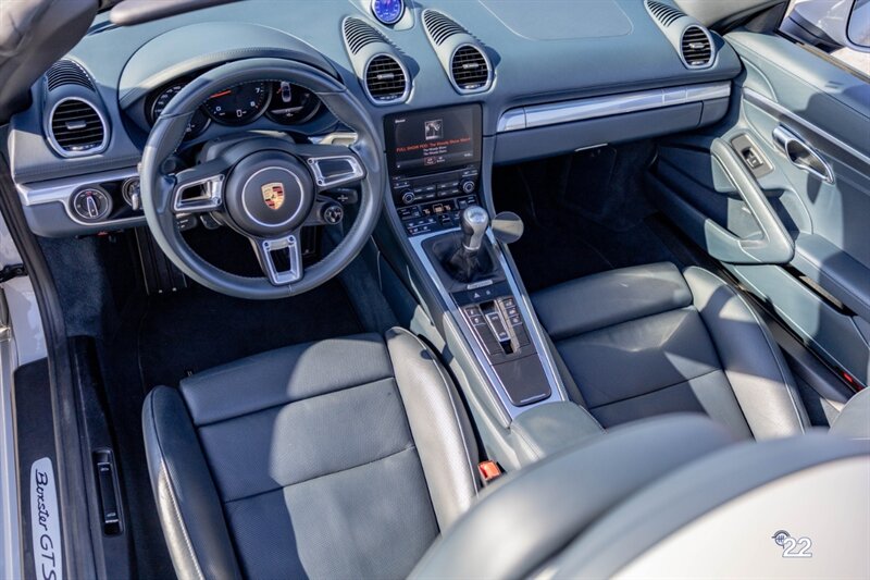 2019 Porsche 718 Boxster GTS in a stunning color combination of Chalk with Graphite Blue interior and a 6 speed manual transmission. Very well optioned with the following; Chalk paint, Full Graphite leather interior, Graphite convertible top, 20" Carrera Classic wheels, Lane change assist, Seat ventilation and heating, Safety bars in Chalk, GT sport steering wheel, Bose sound, Apple CarPlay, Adaptive sport seats 18 way with memory, Premium package plus (2-Zone climate control, light design package, heated/vented seats, auto-dimming mirrors, rain sensors and Porsche Entry and Drive), Seatbelts in Chalk, Porsche crests in headrests and Brushed aluminum gear lever.