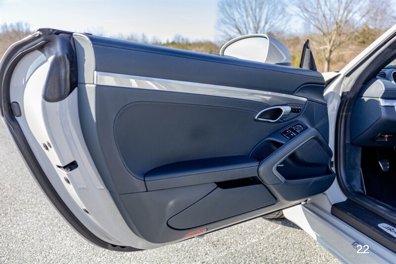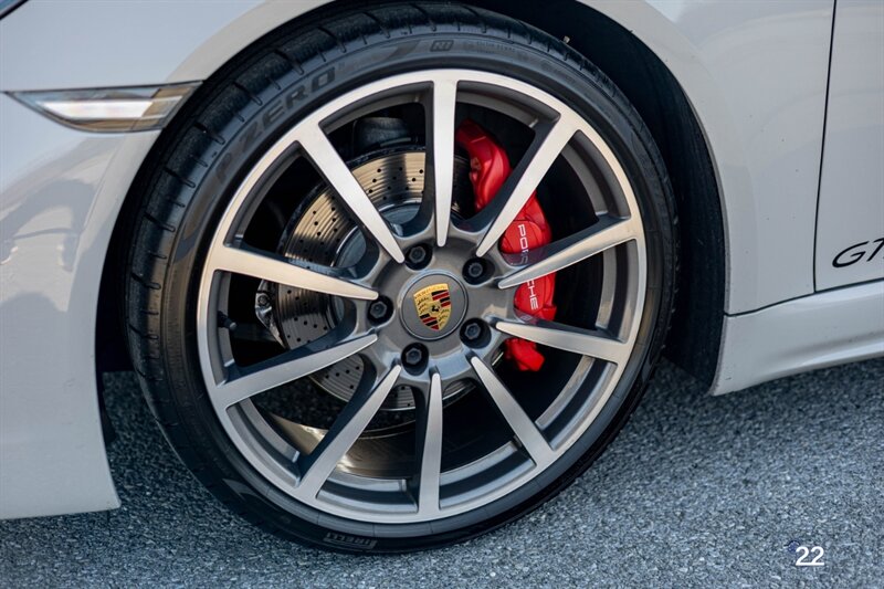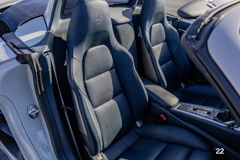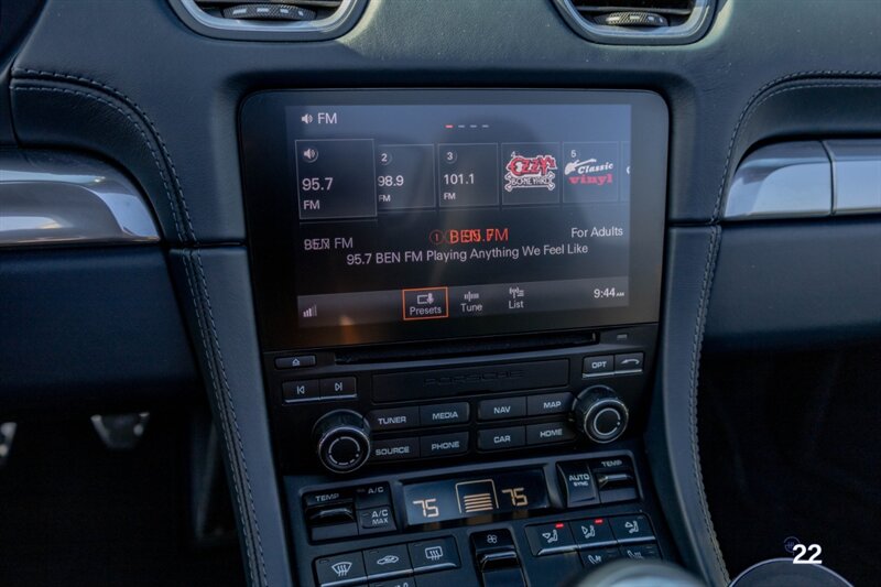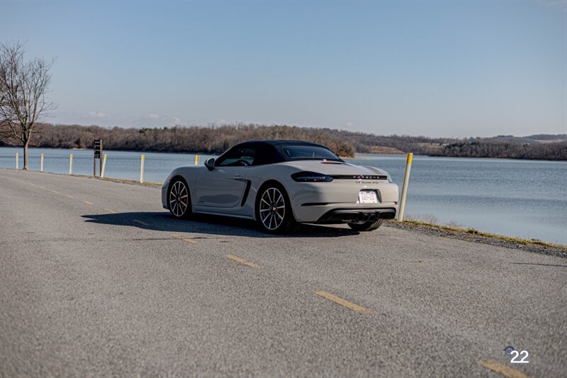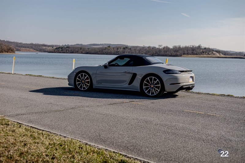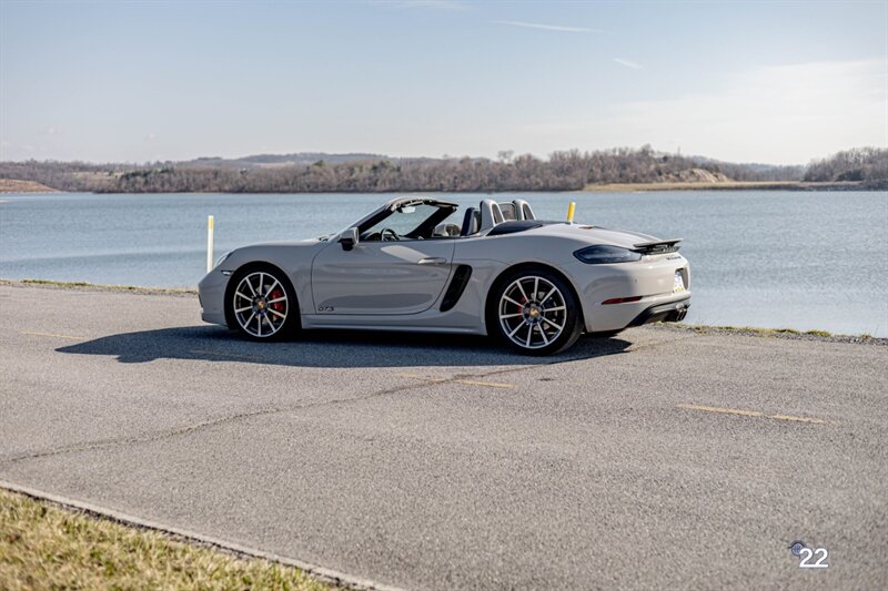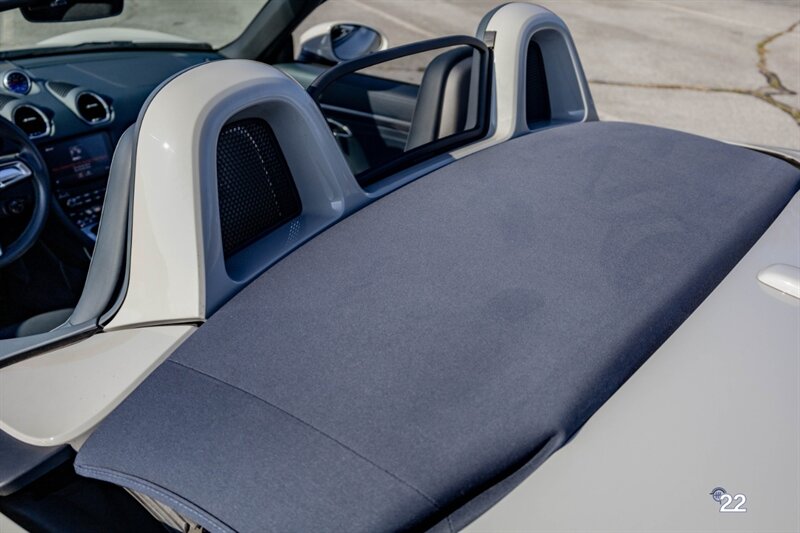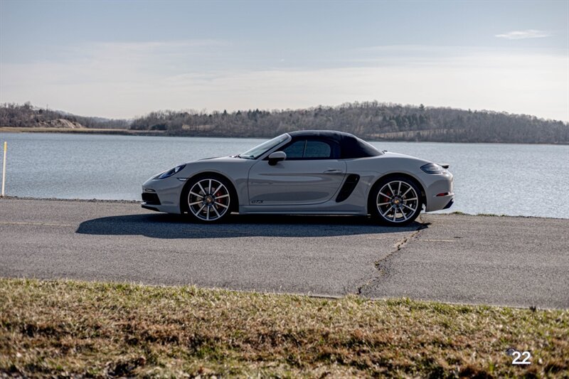 2019 Porsche 718 Boxster GTS in a stunning color combination of Chalk with Graphite Blue interior and a 6 speed manual transmission. Very well optioned with the following; Chalk paint, Full Graphite leather interior, Graphite convertible top, 20" Carrera Classic wheels, Lane change assist, Seat ventilation and heating, Safety bars in Chalk, GT sport steering wheel, Bose sound, Apple CarPlay, Adaptive sport seats 18 way with memory, Premium package plus (2-Zone climate control, light design package, heated/vented seats, auto-dimming mirrors, rain sensors and Porsche Entry and Drive), Seatbelts in Chalk, Porsche crests in headrests and Brushed aluminum gear lever.